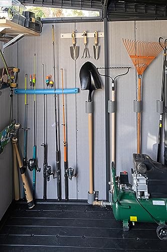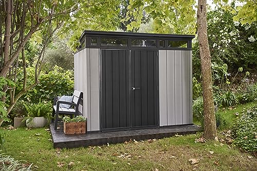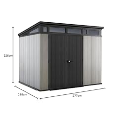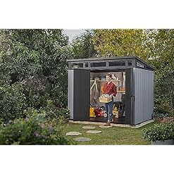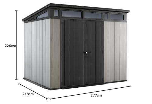 PRODUCT DESCRIPTION A perfect blend of modern design and ruggedness, the cleverly architected Artisan 9×7 shed provides the ideal outdoor storage solution for your garden. The innovative DUOTECH walls are not only highly durable and weather resistant, but they also feature an attractive wood-like texture and paintable surface. Made with a steel-reinforced build, the shed comes with an extra strong roof and a heavy-duty floor that allows you to store even large equipment. The Artisan 9×7 also features double doors, windows, and a locking system. PRODUCT FEATURES Ultra-rugged and weather-resistant build that makes the shed low-maintenance and impressively durable Elegant design that brings style to any outdoor space The innovative DUOTECH walls with steel reinforcements provide a gorgeous weathered wooden texture with all the durability of resin DUOTECH walls are also easily paintable and drillable, making it easy to customize for the look you would like Ideal for storing heavy items thanks to the heavy-duty floor and easy-access double doors Designed with a high ceiling, the shed provides plenty of space for an adult to move around comfortably Pre-cut tongue and groove panels Elegant wood like and feel Top and side windows Lockable (locks not included) Crafted from UV stabilised polypropylene for years of outdoor use Easy DIY assembly” Colour: Deco Grey/ Anthracite PRODUCT DIMENSIONS External Dimensions: 2770x2180x2260mm (FrontxSidexHeight) Internal Dimensions: 2640x2010x2198mm (FrontxSidexHeight) Slab Dimensions: 2770x2180mm (FrontxSide) Weight: 180kg Package Dimensions: 2270x1320x380mm (LengthxWidthxHeight)