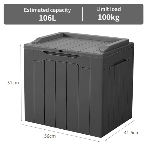 Spacious Secure Storage: Offers a large 106L capacity to neatly store garden tools, pool supplies, cushions, and toys. The lockable lid (padlock not included) keeps your items secure and protected from the elements, making it a great storage organiser